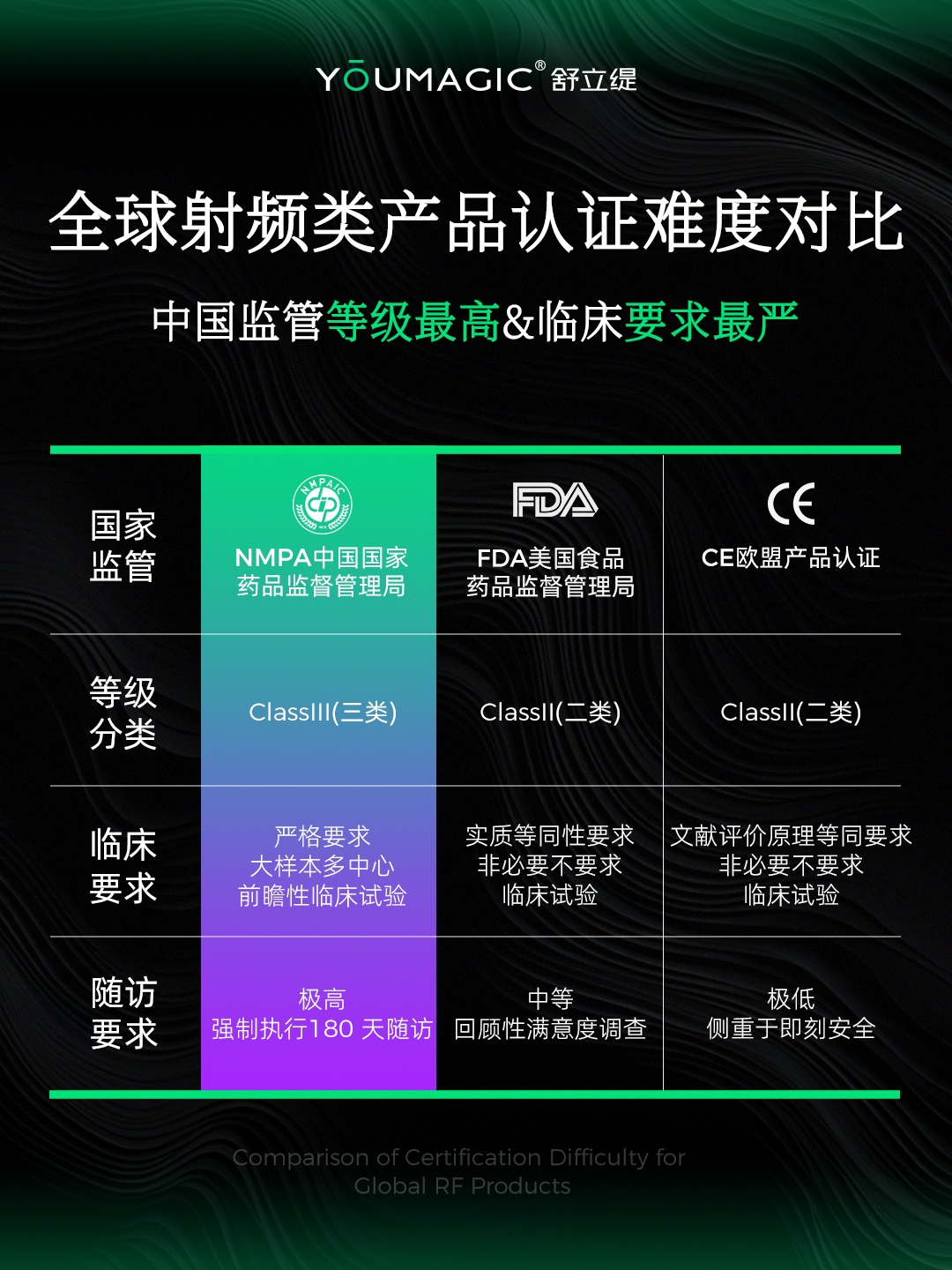 值得关注的不仅是临床数据,还有舒立缇在合规层面的先发布局。2024年12月,YOUMAGIC舒立缇拿下了国内首张射频第三类医疗器械注册证。