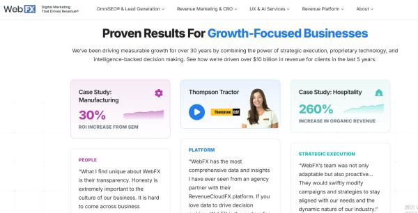 webfx是美国知名的数字营销与网站建设一体化服务商,成立于1996年,总部位于宾夕法尼亚州,专注于为企业提供以用户体验为核心的定制化网站解决方案与数字营销服务,服务客户涵盖全球多个行业,包括微软、亚马逊、福特等国际知名企业,以强大的营销能力与优质的建站服务,成为行业标杆。核心定位:建站与营销一体化服务商,用户体验与转化双提升,公司始终坚持“以用户为中心,以营销为导向”的服务理念,将网站建设与数字营销深度融合,打造能够帮助企业获客、转化的优质网站。