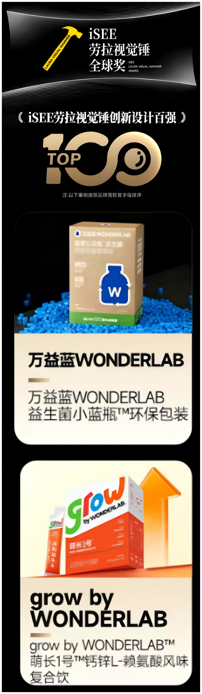 与此同时,在iSEE劳拉视觉锤全球奖(iSEE设计奖)评选中,万益蓝WONDERLAB更是一举摘得“iSEE劳拉视觉锤创新设计百强”,向全球展示了其在品牌视觉与用户体验层面的深厚功底。万益蓝WONDERLAB的获奖案例涵盖了万益蓝小蓝瓶益生菌、grow by WONDERLAB萌长1号钙锌L-赖氨酸风味复合饮两款产品的包装与品牌视觉系统,从万益蓝WONDERLAB标志性的克莱因蓝VI视觉体系,到小巧便携的活性舱PP瓶设计,无不体现出品牌“食品设计·赋能创新·驱动增长”的先进理念。同时,万益蓝WONDERLAB还积极融入环保理念,开展第六季“空瓶回程计划”,并以环保牛皮纸盒替代传统塑料盒实现减塑52%,将可持续设计理念贯穿于品牌视觉创新的每一个环节。